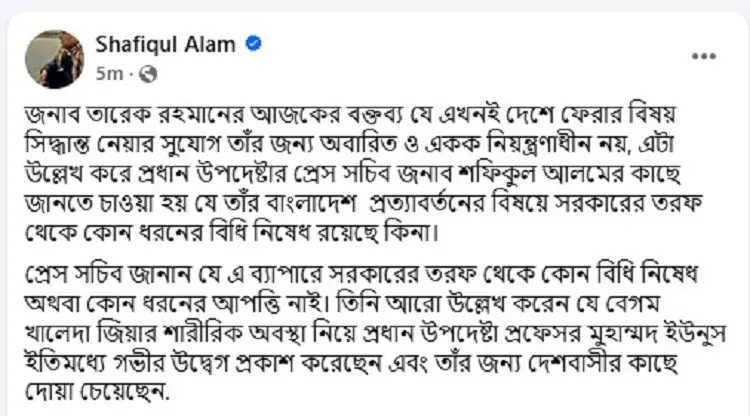 ফেসবুক পোস্টে শফিকুল আলম লেখেন, ‌‘তারেক রহমানের আজকের বক্তব্য যে এখনই দেশে ফেরার বিষয় সিদ্ধান্ত নেওয়ার সুযোগ তার জন্য অবারিত ও একক নিয়ন্ত্রণাধীন নয়, এটা উল্লেখ করে প্রধান উপদেষ্টার প্রেস সচিব শফিকুল আলমের কাছে জানতে চাওয়া হয় যে তার বাংলাদেশ প্রত্যাবর্তনের বিষয়ে সরকারের তরফ থেকে কোনো ধরনের বিধিনিষেধ রয়েছে কি না।’